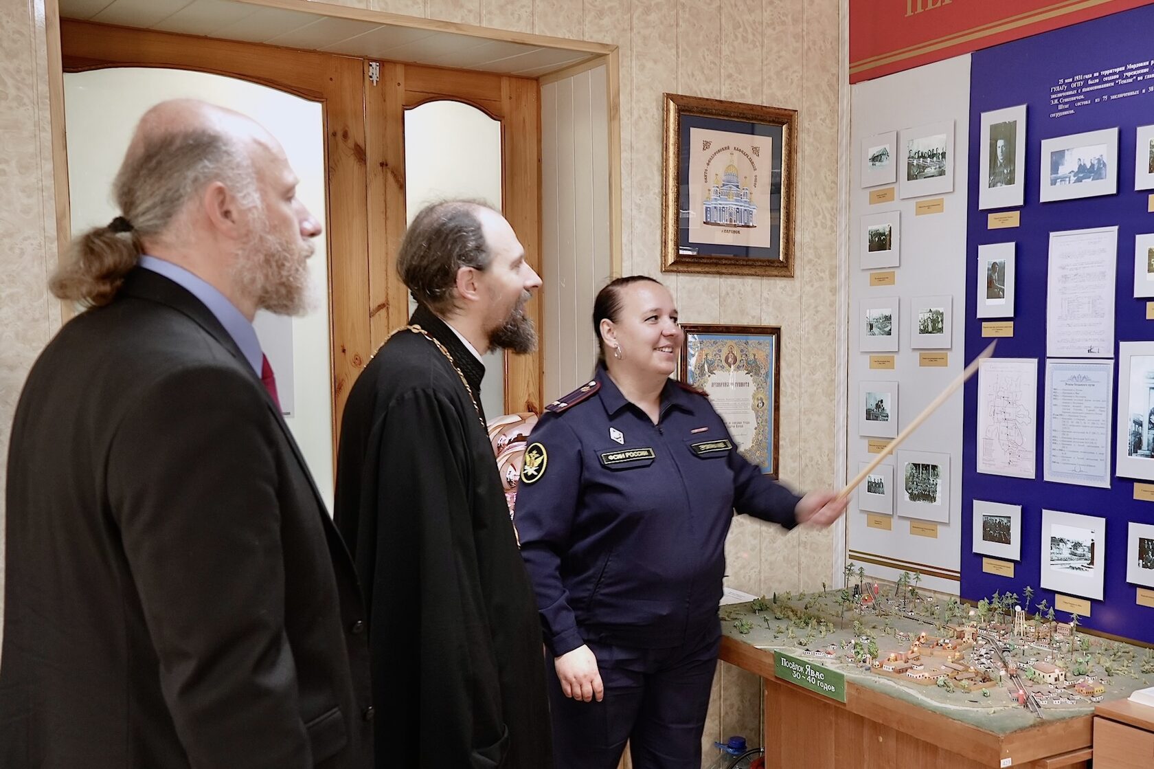 Далее на территории Управления делегация Синодального отдела по тюремному служению ознакомилась с постоянно действующей экспозицией, рассказывающей об истории создания и развития УФСИН России по Республики Мордовия, уникальность которого состоит в том, что здесь на сравнительно небольшой территории сконцентрировано большое количество учреждений УИС разных режимов, в том числе для осужденных к пожизненному лишению свободы.