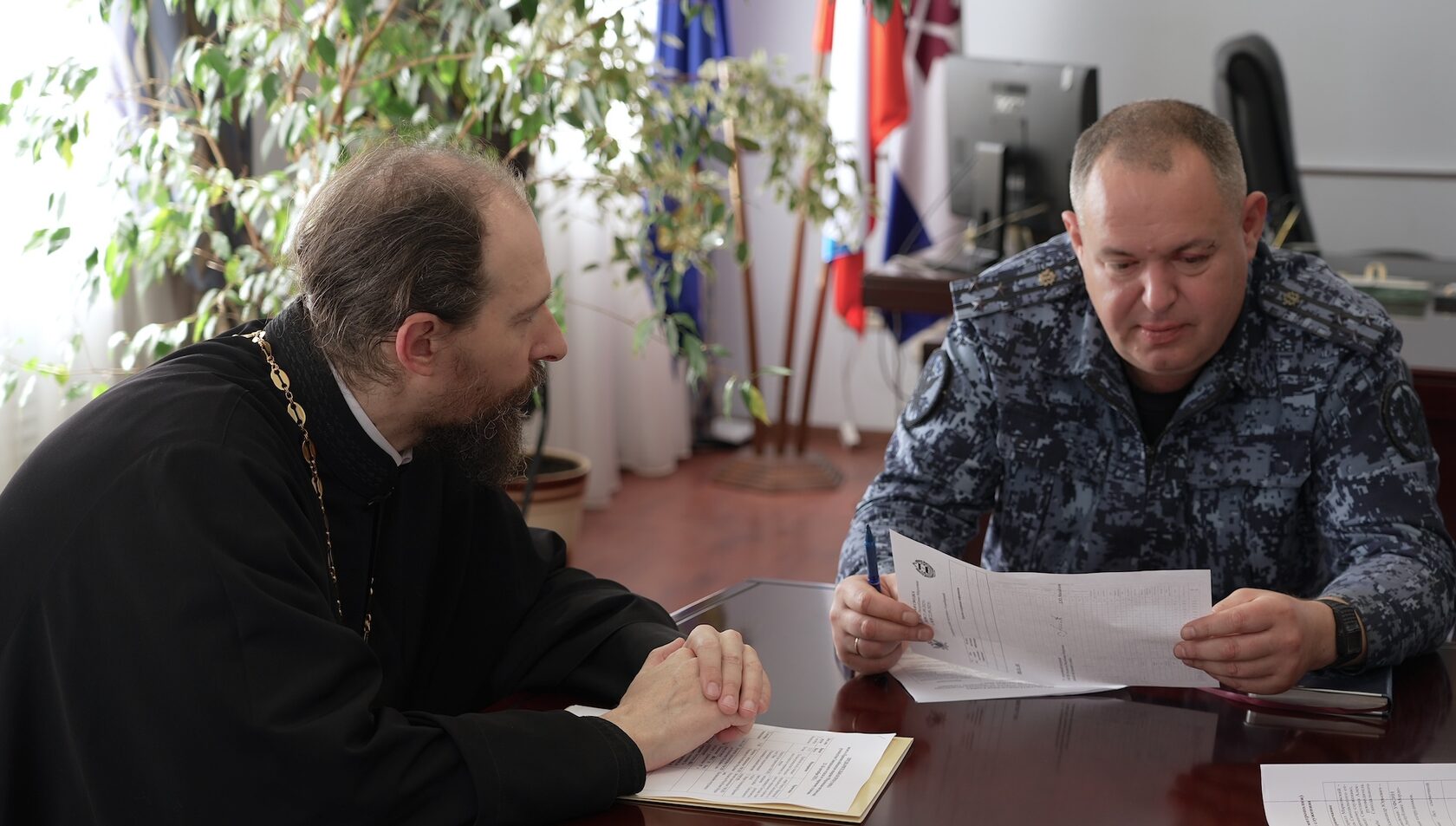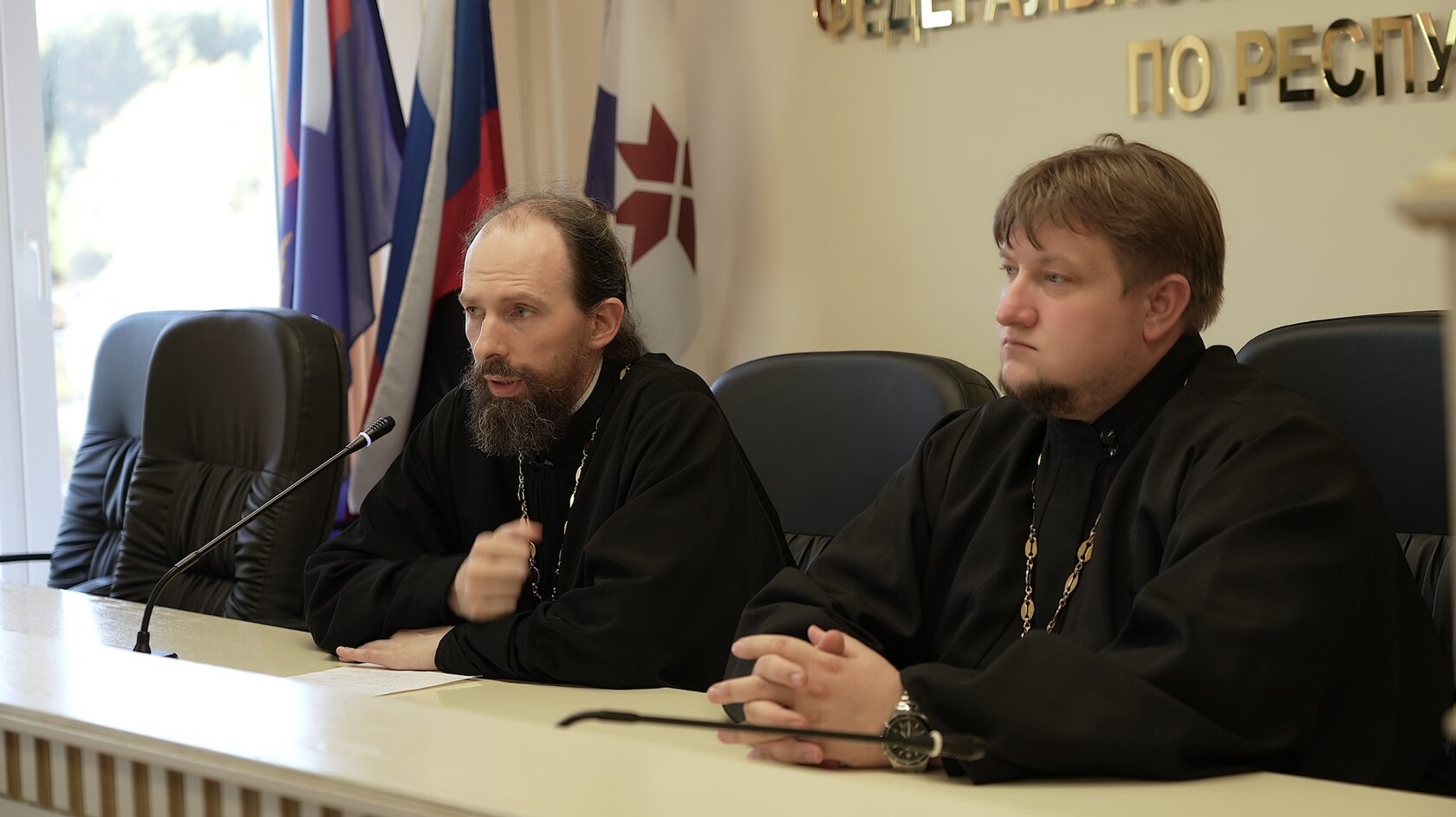 В первый день рабочей поездки глава Синодального отдела по тюремному служению иерей Кирилл Марковский в сопровождении секретаря Синодального отдела Александра Мороза и помощника начальника УФСИН России по организации работы с верующими иерея Иоанна Левштанова встретился с начальником УФСИН России по Республике Мордовия полковником внутренней службы Виталием Перхоровичем. В мероприятии приняли участие представители руководства территориального органа УИС. Стороны обсудили вопросы, связанные с духовным попечением о лицах, содержащихся в учреждениях УИС региона, а также с организацией духовно-просветительской работы с сотрудниками пенитенциарного ведомства.
