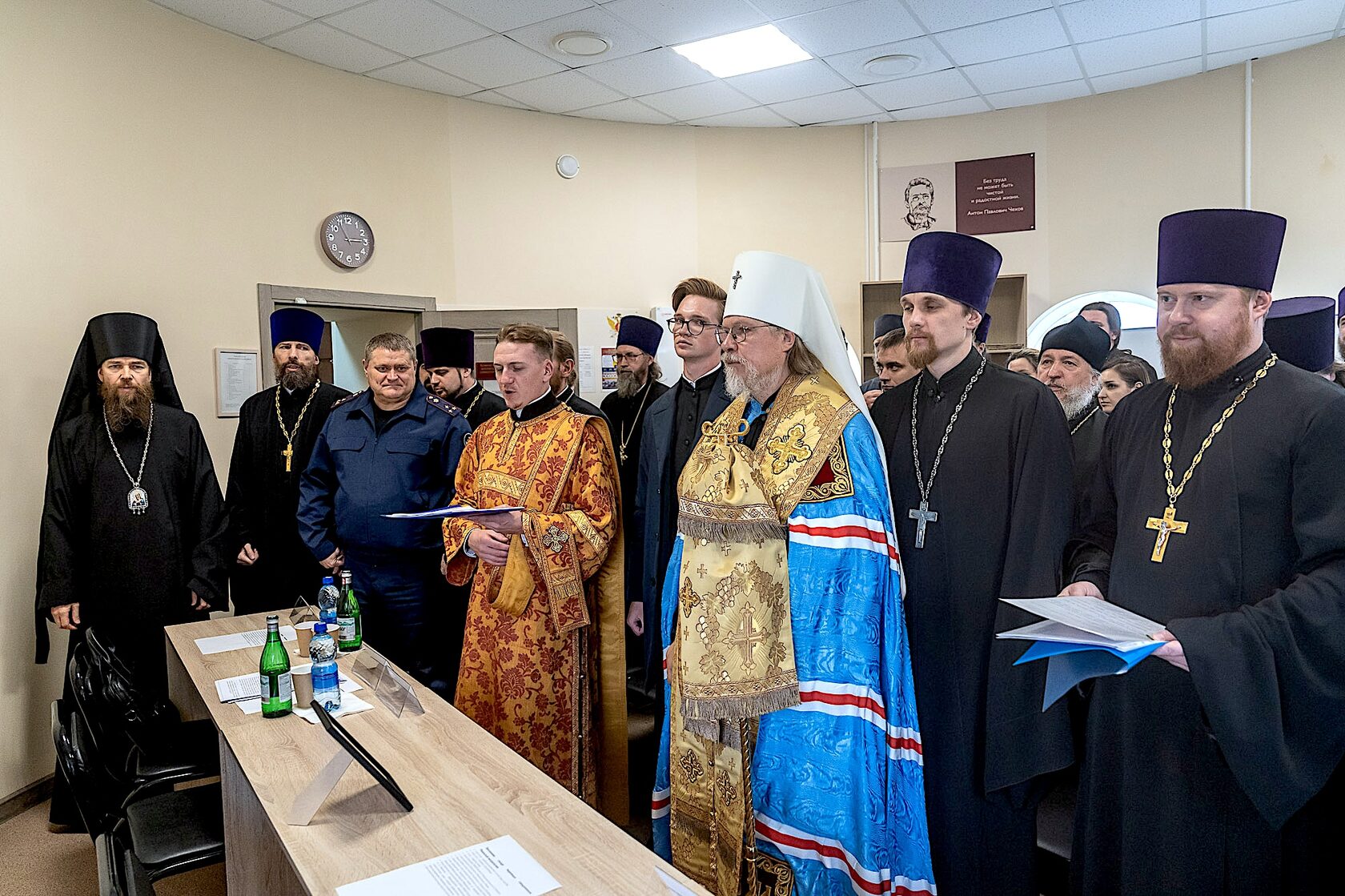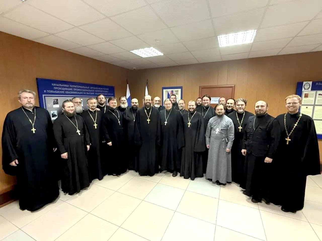 Визит начался с посещения Академии ФСИН России, где отец Кирилл встретился со священнослужителями, замещающими должности помощников начальников СИЗО по работе с верующими и проходящими обучение на курсах повышения квалификации в ведомственной образовательной организации.